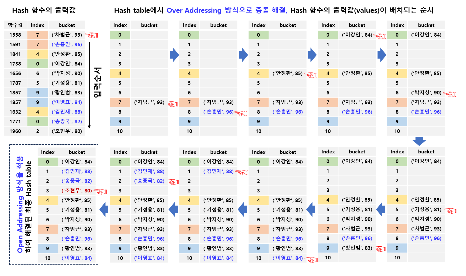 - 위 [그림1]을 참고해보자. 한 예로, index 7번에서 먼저 대입된 데이터 ('차범근', 93)이 나중에 대입된 ('손흥민', 96) 으로 덮어씌워졌다(overwriting). 다른 index 4, 0, 9 번의 중복된 경우도 마찬가지다.