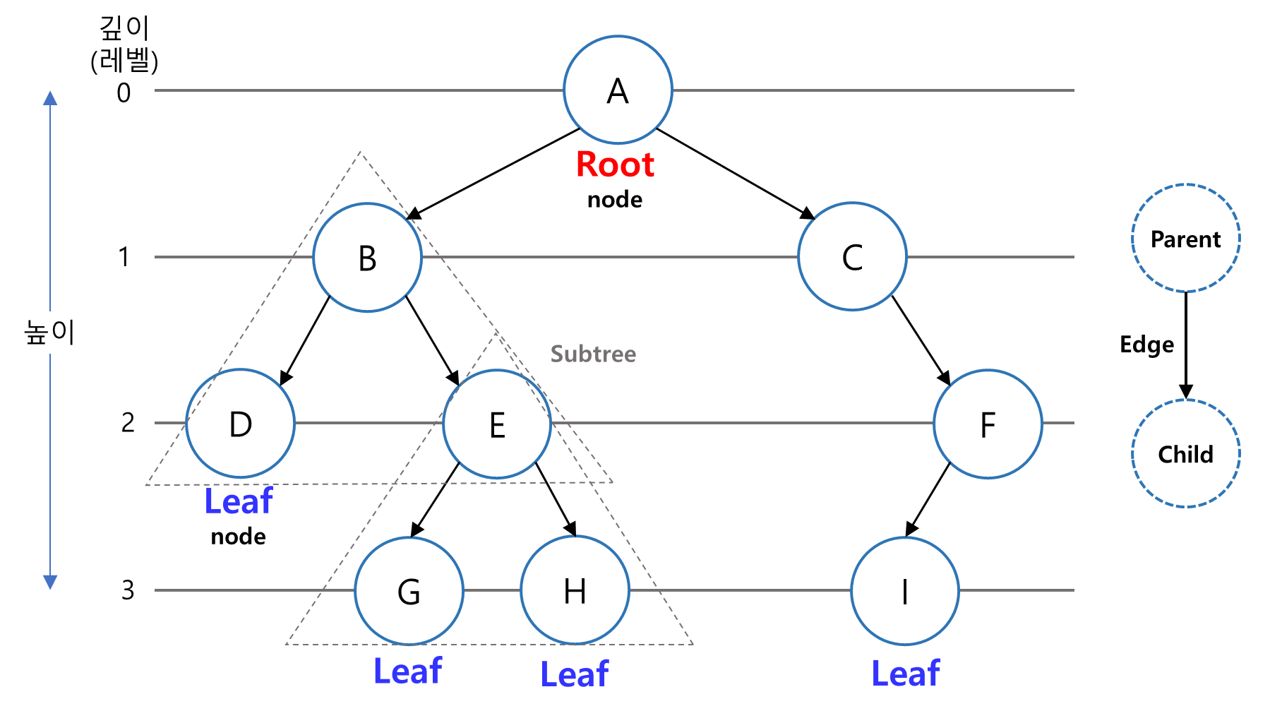 | Subtree (서브트리) | 특정 노드에 종속된 하위 전체 트리 |