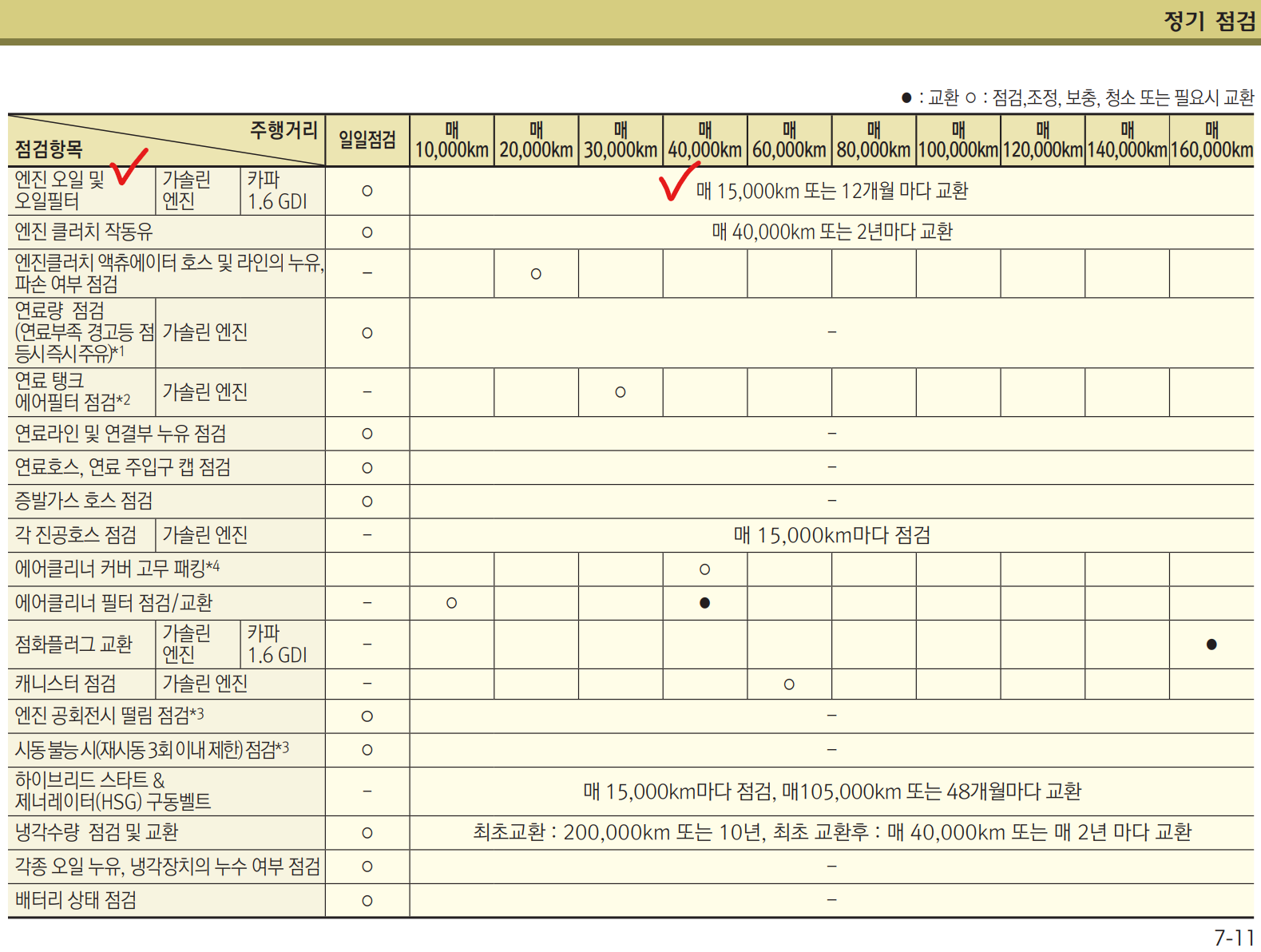아래는 기아 니로 하이브리드의 정기 점검 메뉴얼표 입니다. 하이브리드의 경우에는 EV모드로 주행시 엔진이 멈춰있는 경우도 무시할 수 없지만, 그럼에도 가혹조건의 경우와 일반적인 경우에도 모두 7500km, 15000km (또는 매 12개월)로 잡고 있습니다.