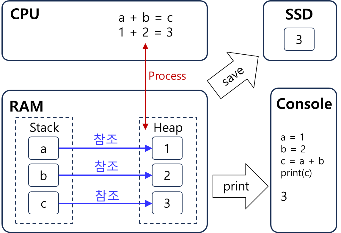 그리고 CPU에서 a + b = c 라는 연산 수행을 하게 되면(process) , 다시 RAM에서