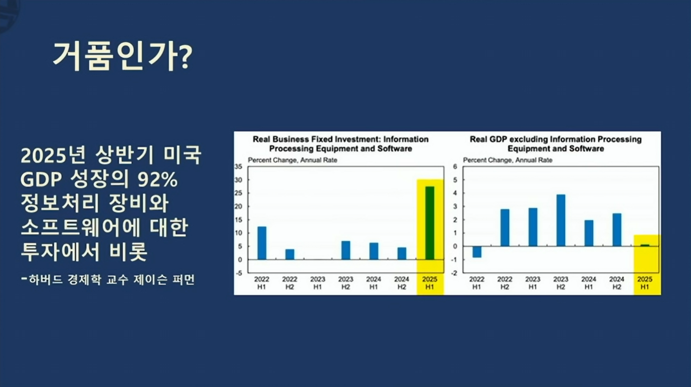- 또한, 2025년 상반기 미국 GDP 성장에서 정보처리 장비와 소프트웨어에 대한 투자가 차지하는 비중이 무려 92%에 달한다고 한다. 그만큼 AI가 미국의 GDP를 멱살 잡고 견인했다는 말이 된다. 이 또한 AI를 거품으로 인식하도록 만들기에 충분하다.