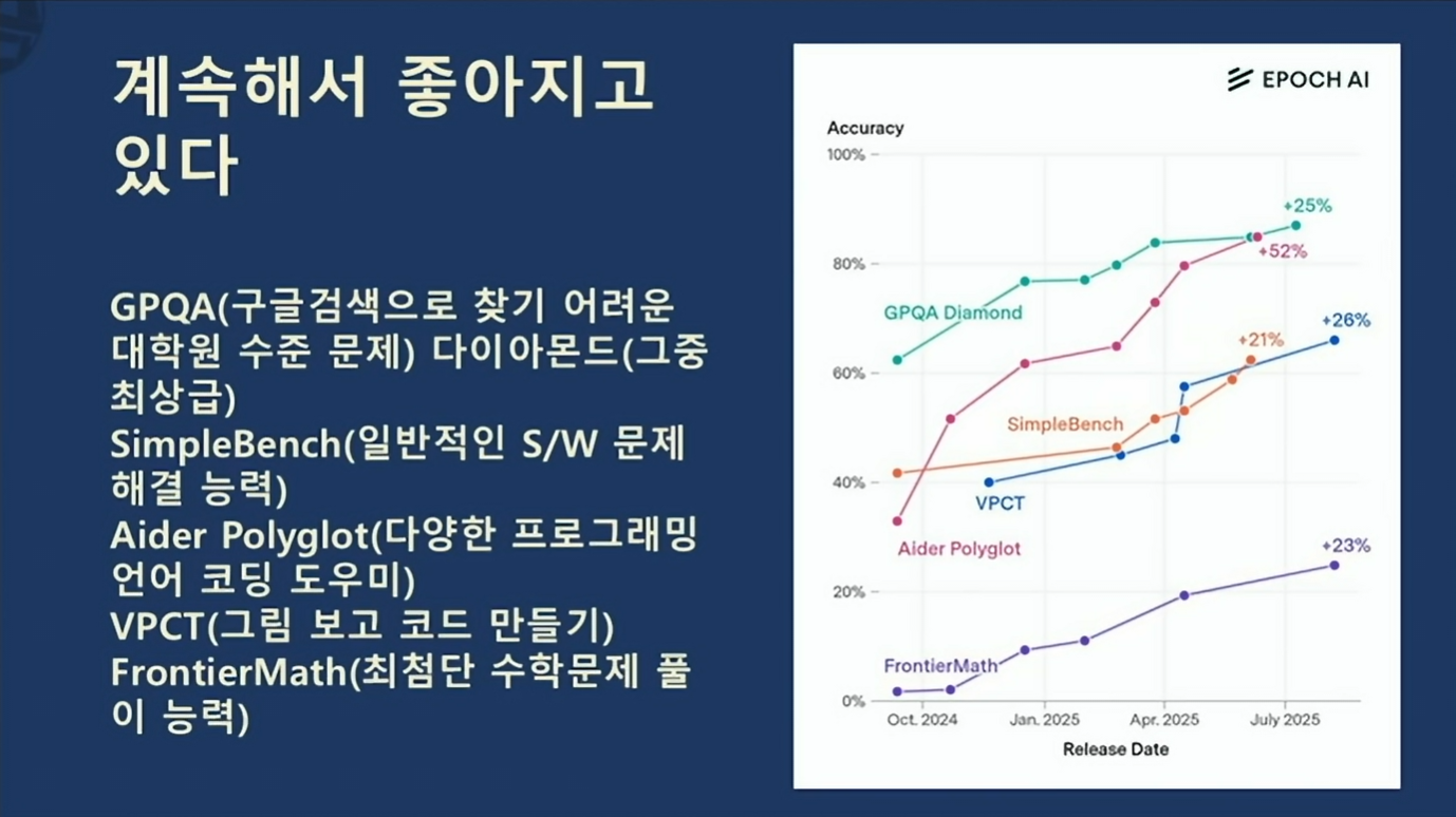 AI 성능의 상승세가 둔화되지 않고 오히려 작년 10월부터 지금까지 점점 가속화되고 있으며, 한글로 작성한 질문에도 매우 자연스럽고 정확하게 반응해 사용자 경험이 크게 좋아졌다고 강조했다.