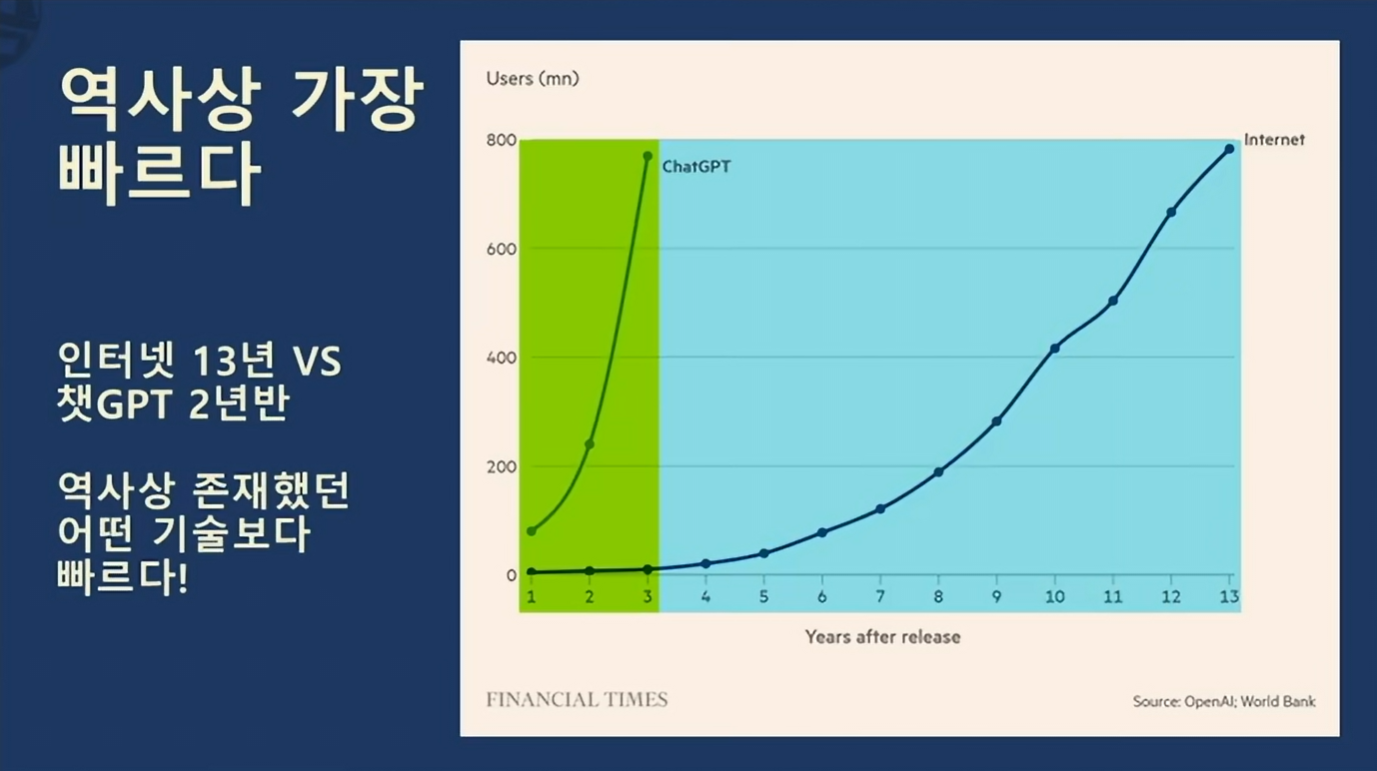 - 사용자 8억 명을 확보하는데, Internet이 13년이 걸렸는데(하늘색) ChatGPT는 불과 3년 남짓(왼쪽 연두색) 걸렸다.