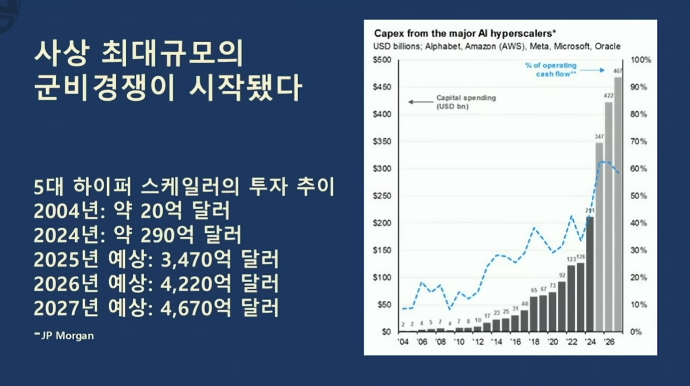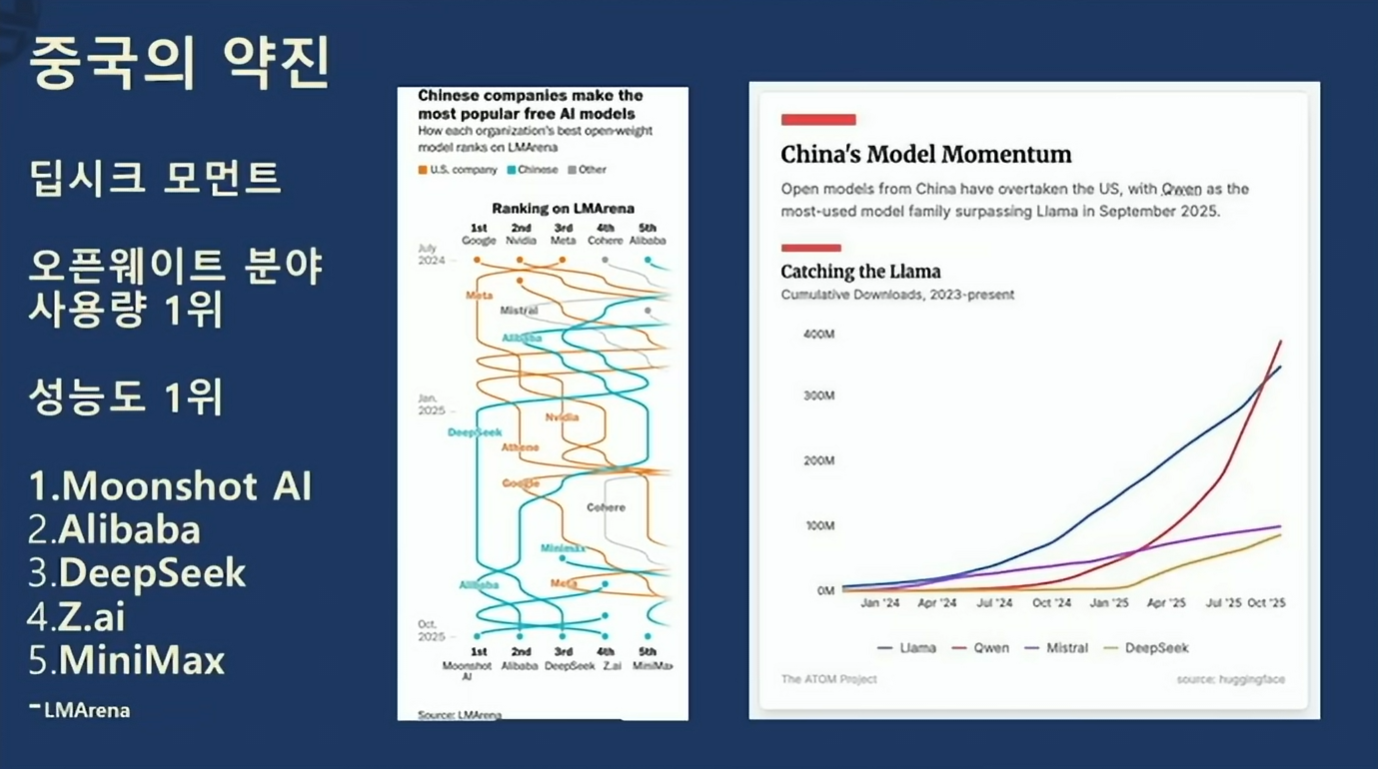 중국 AI의 급성장도 주목했다. 중국 AI 기업들이 미국 빅테크들을 제치고 상위 5위 내 순위를 휩쓸며 데이터 센터 투자를 올해(2025년) 4,220억 달러까지 대폭 확대하고 있다고 한다.