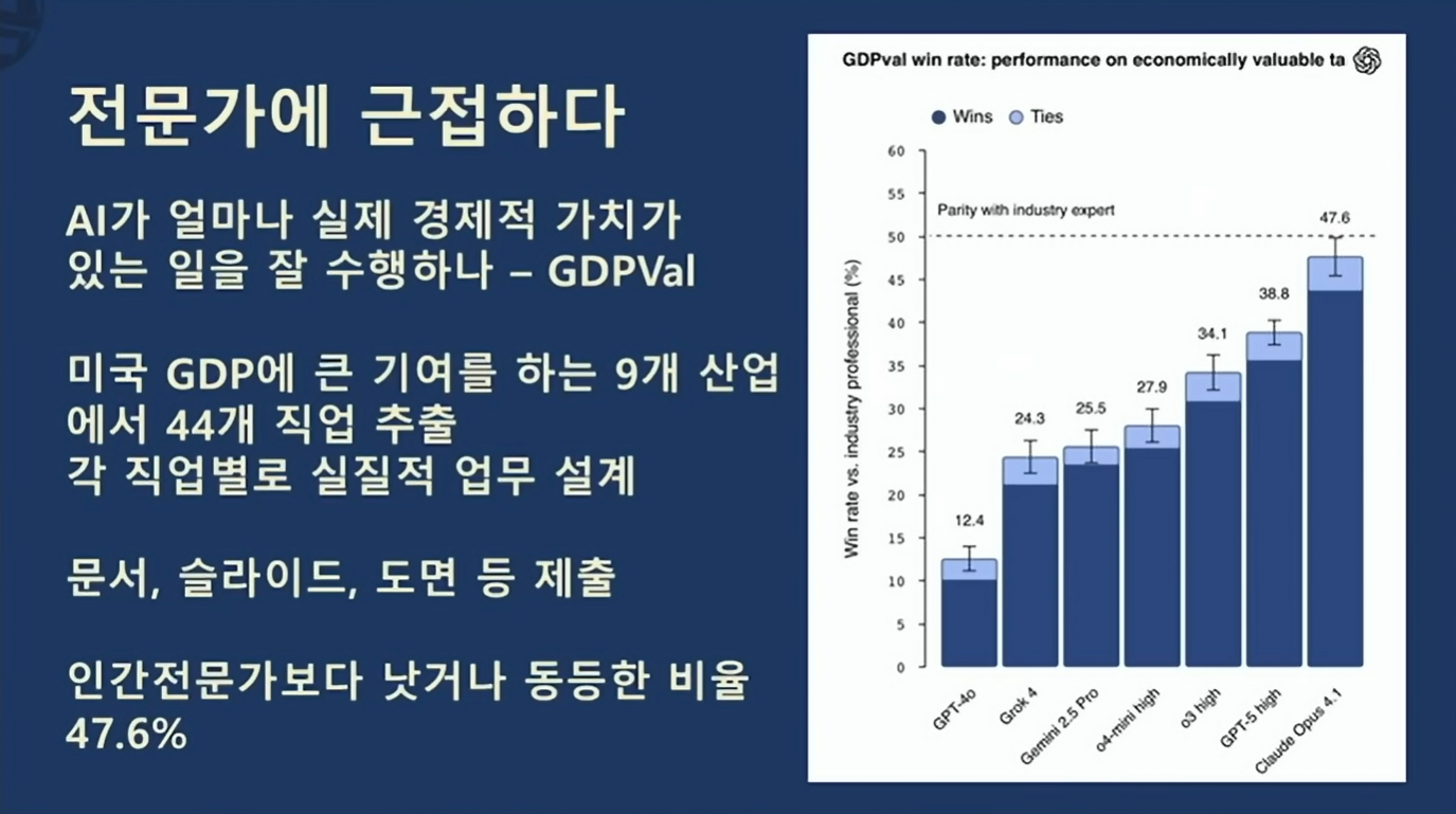 아래표는 OpenAI에서 내놓은 자료인데, 9개 산업, 44개 전문가 직업을 AI와 비교해보니 인간 전문가보다 더 우수하거나 동등한 수준을 보여주고 있다고 한다(Claude Opus가 가장 앞서고 있다.) 예상과는 달리, 단순 작업과 같은 것이 먼저 대체되기 보다는 오히려 고도의 전문성과 깊은 숙련도가 요구되는 전문가 영역이 더 먼저 빠르게 대체되고 있다고 한다.