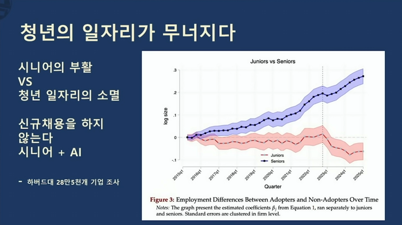 - 현재 진행형으로 AI가 노동시장에 미치는 충격과 청년 일자리 감소 문제 및 시니어 전문가의 중요성 대두.